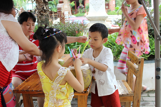 晚上吃饭在傣家人,味道很好,价格合理。三个小家伙把一个大椰子搞定了,还搞了个释迦菠萝,狠啊。