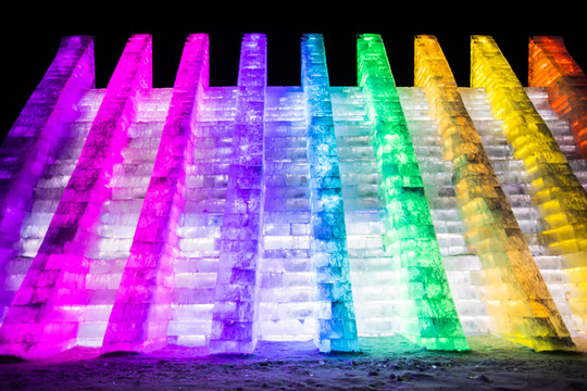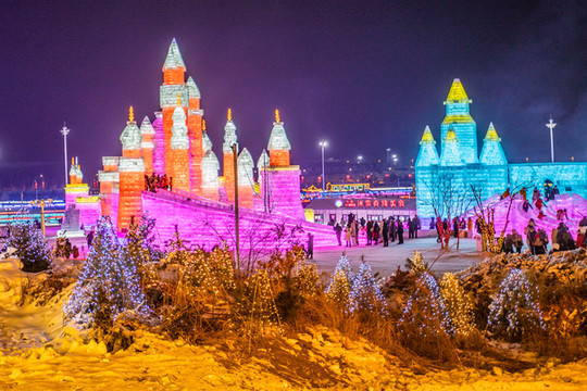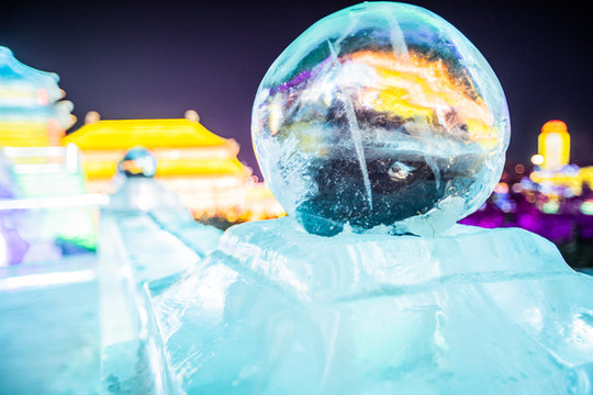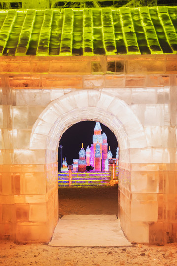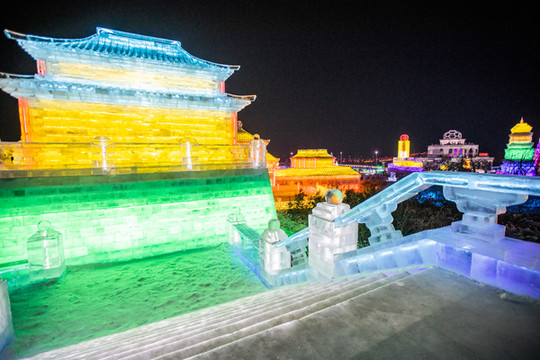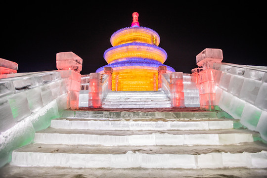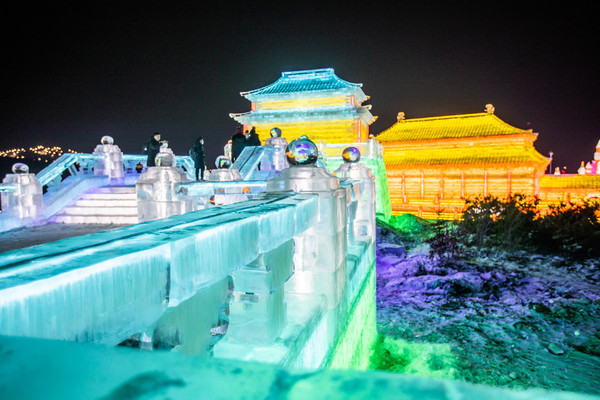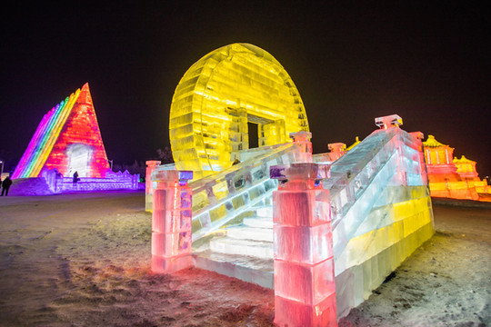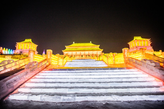 由冰块建成的 太和 殿,在夜晚闪着金黄的光芒,真是绚丽又浪漫。