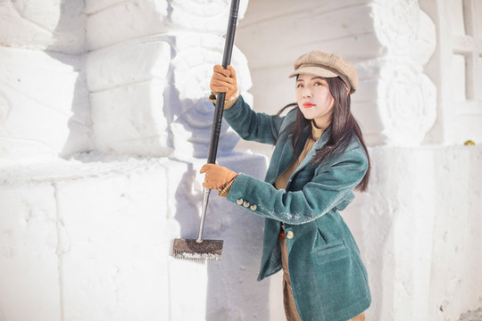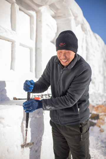 在院子里溜达,发现了那边还有几个雪房子在施工,原来这些雪墙都是从外面运过来的雪,摆在民宿的门口,再由工人们慢慢雕琢出雪房子的样子,从窗棂格子到木头纹理都特别精细,特别有意思,我也来试试!