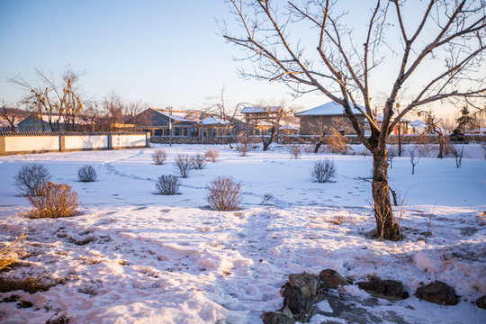我们入住了天定山民宿,这里是一片的传统风格的小院子,门前屋后都是厚厚的积雪,院门和树上都挂着玉米,特别有特色。民宿前有一条小河,夏天里肯定是绿草如荫,冬天里是白雪覆盖的浪漫。