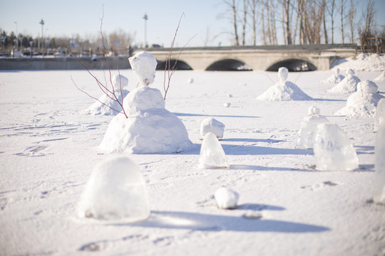 安顿好后到门口看看,白茫茫的雪原无比清新,门口的小河已经完全被冻住,民宿堆了一排雪人,还做了一些冰块的装饰,在清晨的阳光下闪闪发光。