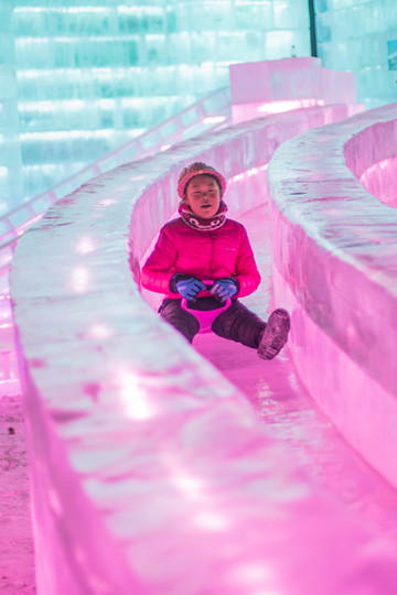往里走会看到女生最爱的冰雪城堡,在各种色彩中真是梦幻极了。这两个城堡还有小型的冰雪滑滑梯,适合小朋友和胆子小的朋友去玩。