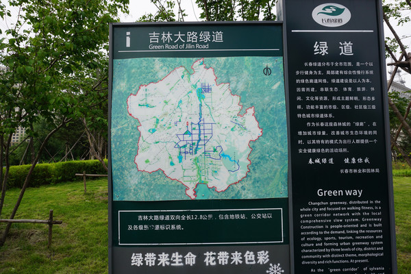 长春道路中有绿道的交通标识。广场边有关于此地区的绿道概况介绍。“绿道”是一种可供居民、游客徒步骑游的自然和人工廊道。在生态环境好的地段开设绿道能让老百姓享受环保的生态、还能休闲娱乐、强身健体。绿道沿线也有一些城市景观,给当地人和游客都有更好的感官体验。