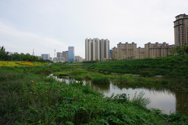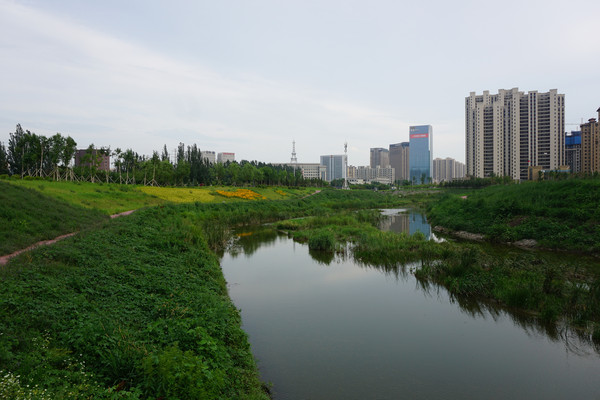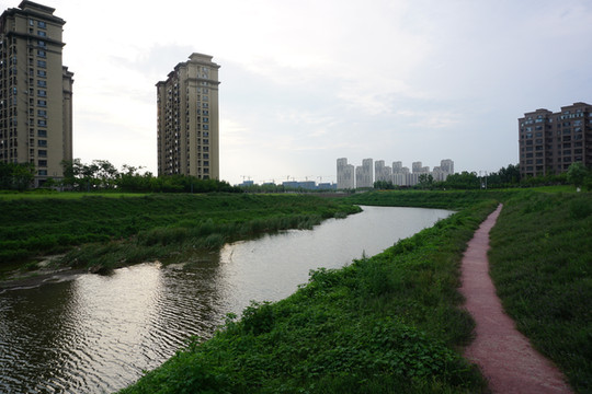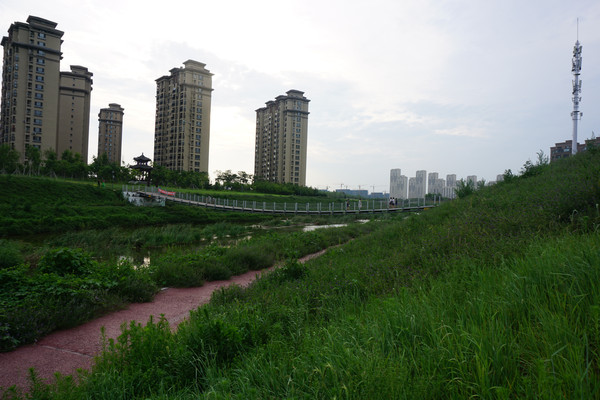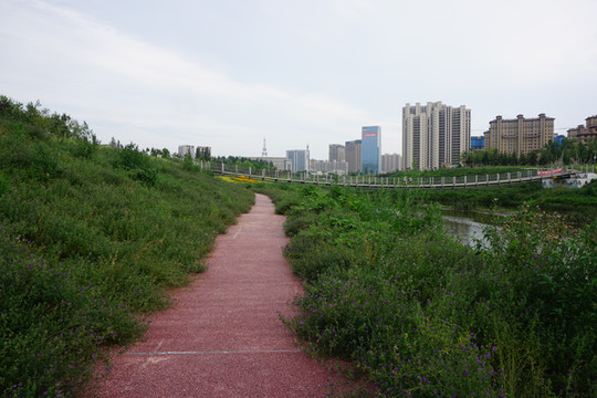 河道边一条红色的步道。红色在绿色的植被中尤为好看。
