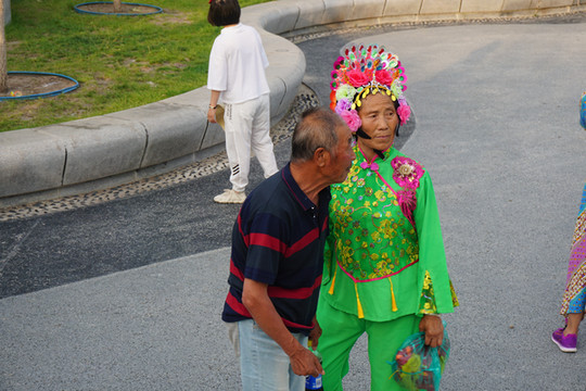 一对老者,很早我就看到他们来到广场,看了一会表演他们起身来到小广场的另一边。刚开始我还不明白女子这样的打扮是怎么回事。