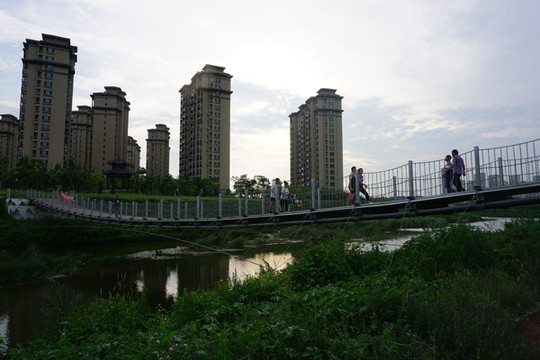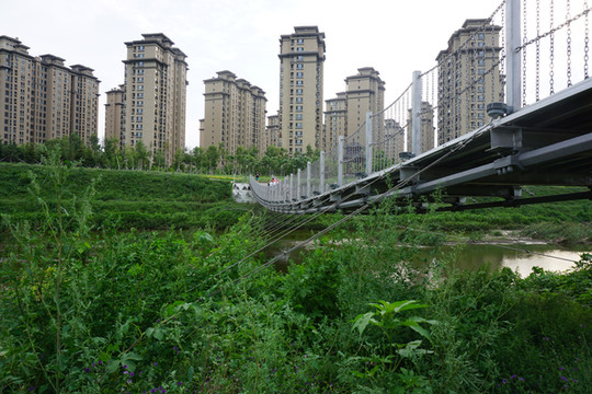 近看这座轻盈的悬索桥,桥成了河道两岸人们的方便通道。