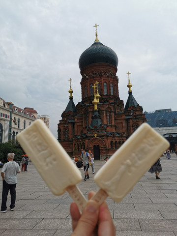 参观教堂内部凭门票还有送马迭尔冰棍,就作个背景留张影吧