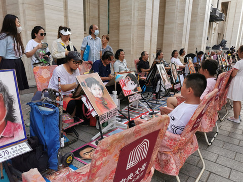 中央大街上一字排开的绘画艺人,有小朋友上前试画,画家是真功夫。
