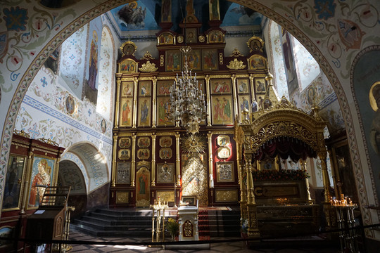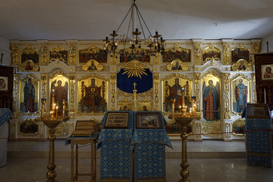 修道院旁的喀山圣母大教堂,这也是座东正教教堂,外观华美,里面像宫殿一样辉煌,墙壁和穹顶上画了很多神和圣人。这座教堂里面可以拍照,但我们到时正好在进行礼拜仪式,怕打搅到别人,只是在教堂里站了一小会儿。东正教的教堂每天早晚礼拜两次,礼拜时,唱的圣歌似天籁。它是伊尔库茨克乃至整个西伯利亚地区最为华美的教堂。(手机拍摄)