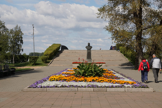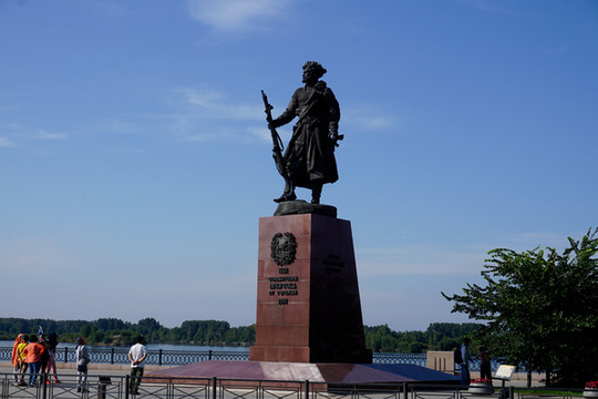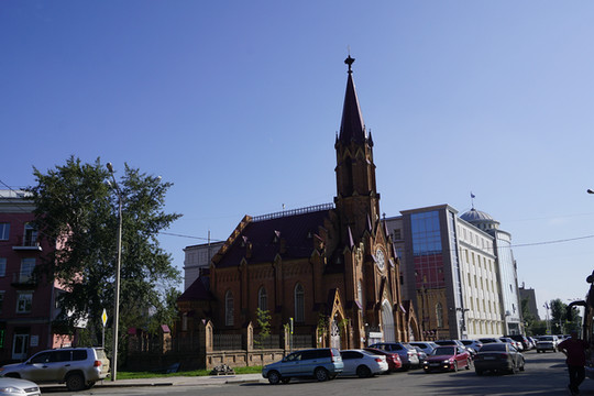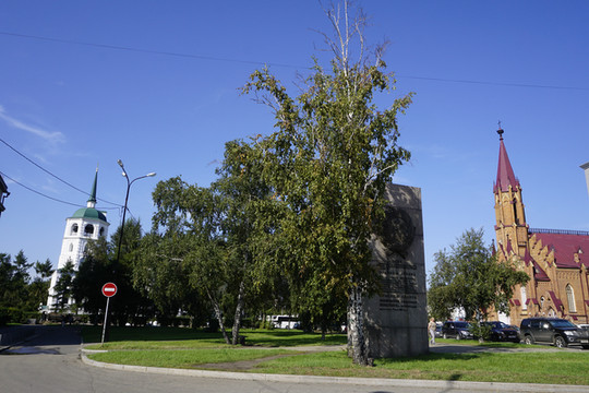 市政府大楼旁的列宁纪念碑、东正教堂与基督教堂和谐相处(这个城市一共有22座东正教教堂、几座基督堂、1座喇嘛庙、1座清真寺。),在俄罗斯虽然改制了,但以列宁、斯大林的苏维埃社会主义的纪念物还都完好的保留着,一路走来未见破坏的纪念物,俄罗斯人就是素质高。社会发生变革与历史遗物无关。