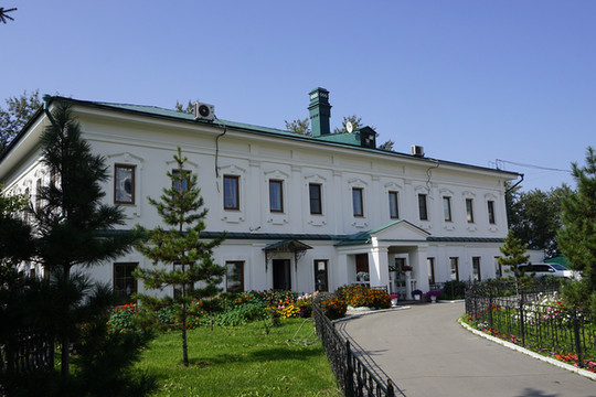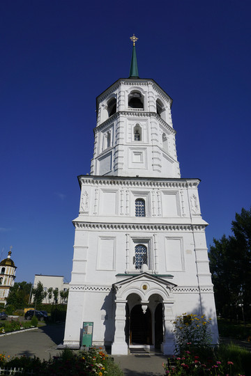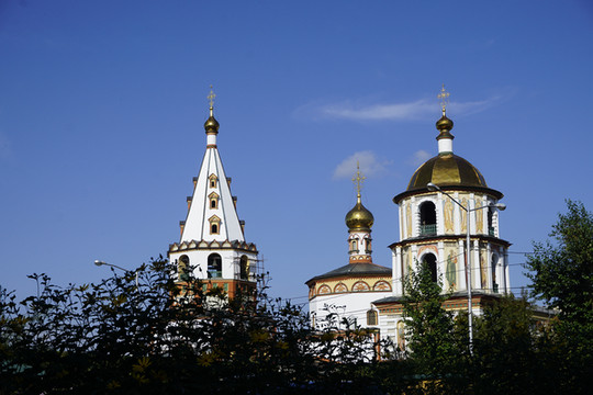 救世主教堂的正门与钟楼。教堂是一座传统的东正教,教堂是伊尔库茨克市历史上第二座石头建筑。白色的墙壁和绿色的屋顶搭配得非常漂亮,地图上有的显示为“救世主教堂”