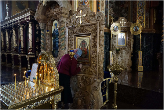 东正教是画像崇拜,所以在教堂内不设有雕塑。有的是丰富而精美的壁画,游客可以免费参观。教徒信众在进门和出门时都需要正面面对塑像壁画对胸划十字,表示尊敬。手持蜡烛,点灯静默祷告。
