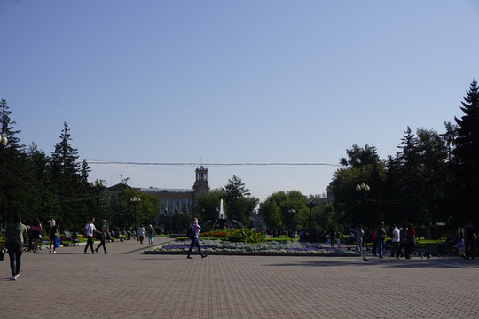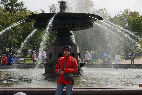 市政府广场上的喷泉,如是周未,所以这喷泉周围来休闲的人比较多,有一些俄罗斯妇女摆卖一些家庭制作的小手工艺品。我初次出国不知人家让不让拍照,所以未敢拍照,现在想起还真是有点后悔怎没有拍几张呀。我们用了一下午的时间游览了伊尔库茨克市区,现在回旅舍准备第二天一早去贝加湖的行囊。