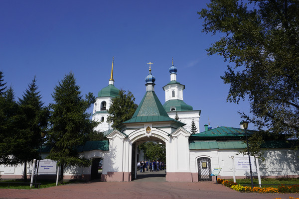 不远处的东正教堂,金光灿灿,色彩夺目。主显节教堂(圣显教堂),据说它是伊尔库茨克市第二古老的建筑。此教堂正在维修,不对外开放,故没能进去。