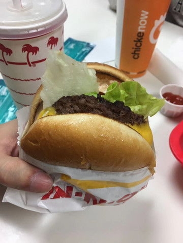逛完奥莱有点晚了,找到朋友推荐一定要去尝尝的in & out吃汉堡,果然和国内的不一样,他们的牛肉都是现烤的,热乎乎的,有汁水,国内的肉柴柴干干的。