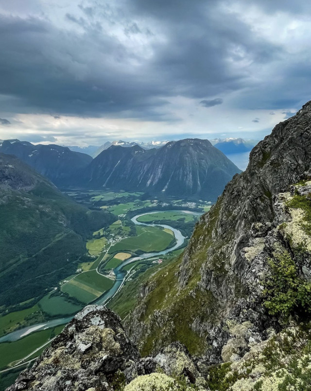 罗姆达尔山脊位于挪威“登山之都”的翁达尔斯内斯,这里有着高而险峻的山峰,也藏着奇而罕见的美景。蜿蜒的河水从两侧的田地穿过,由翁达尔斯内斯汇入峡湾,向着远方奔腾而去。