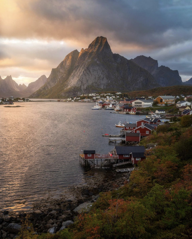 ,远处的晚霞同周遭的房屋小船一并倒映在峡湾之上,宛如一颗颗串起来的珍珠镶嵌在海面上,又似上帝打翻的调色盘,将整个天地之间都渲染上无与伦比的色彩。俯仰之间皆是美景,随手一拍就是明信片。