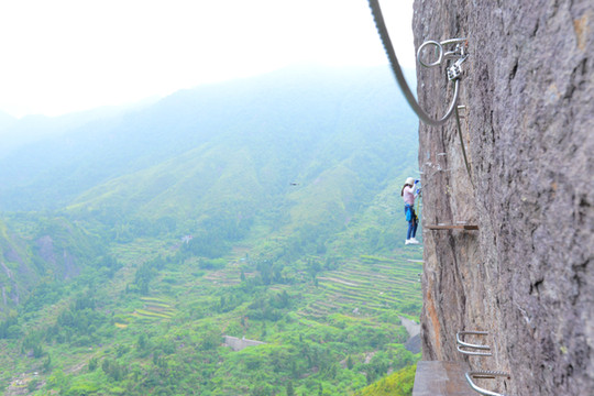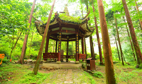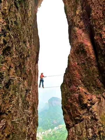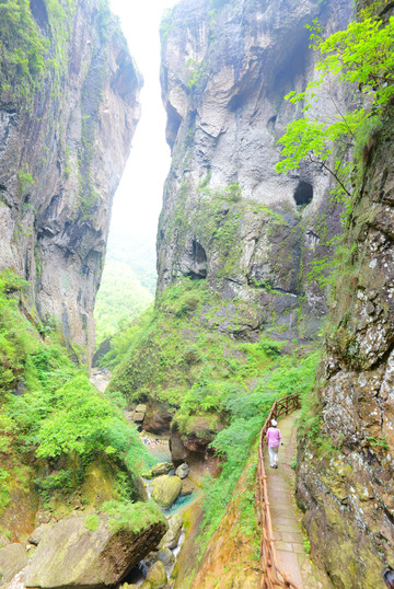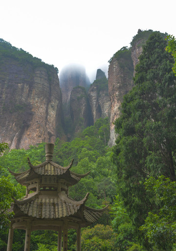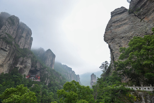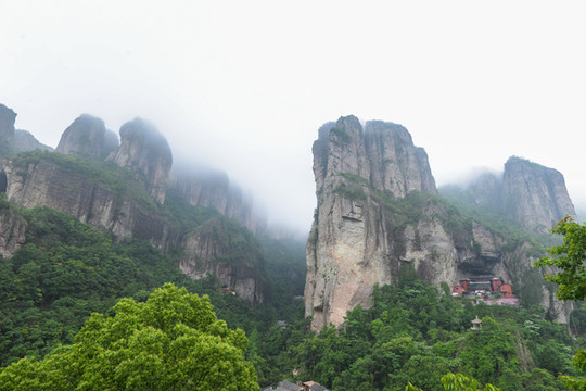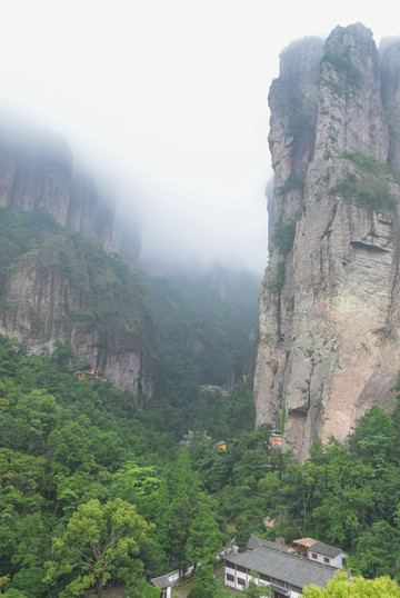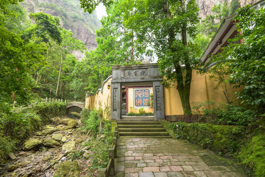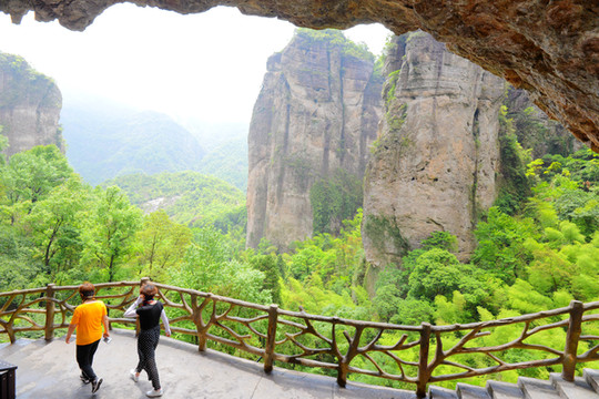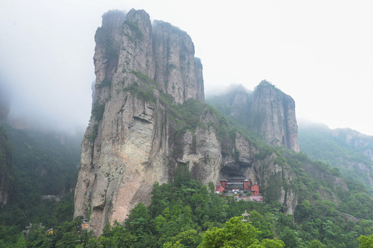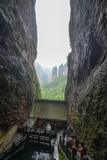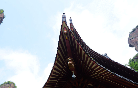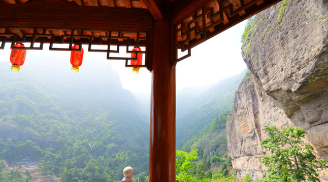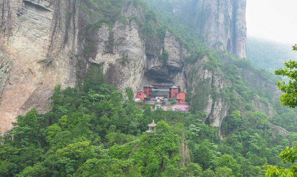 情人峰中间裂开了一条缝,缝中有座九层的大殿,道观、佛庙、庵,三教在此和谐共处,为灵峰増添了浓厚的宗教色彩。