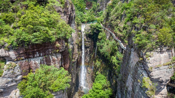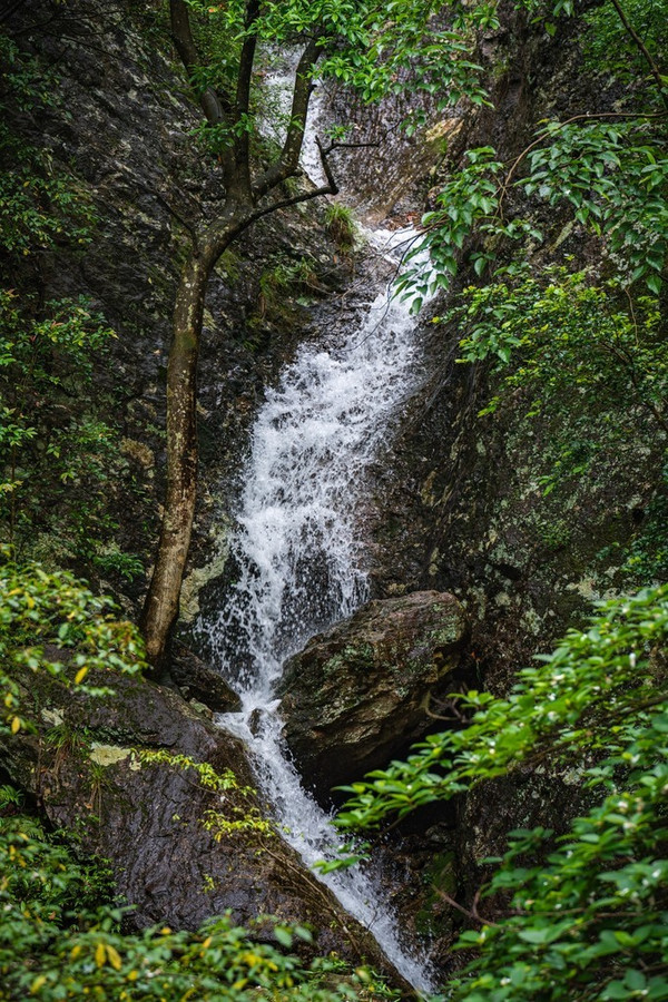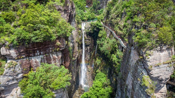 入景区不远处便可达有“天下第一门”之美誉的显胜门。只见两面陡峭崖璧对峙而立,雄伟峭拔、直入云霄,就像两扇巨大的石门矗立在世人眼前。两石门高约百丈,中间间隔仅十余米,及至崖底,抬头仰望,只见两崖顶壁复合,仅留一线,“非中午夜分,不见日月”,像极了我们常说的“一线天”。穿行其间,只感觉凉风习习,光线幽暗,深邃静谧,别有洞天。拾级而上,只见悬崖岩褶中一条白练飘然而下,或激越,或舒缓,水量不大,姿态婀娜,这就是著名的“含羞瀑”,又名“飞湫”,与大龙湫、小龙湫并称北雁“三湫”。瀑下水潭清可见底,据说是剧中小龙女的沐浴之所。