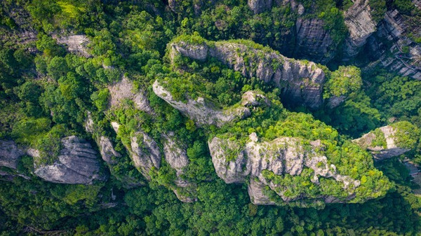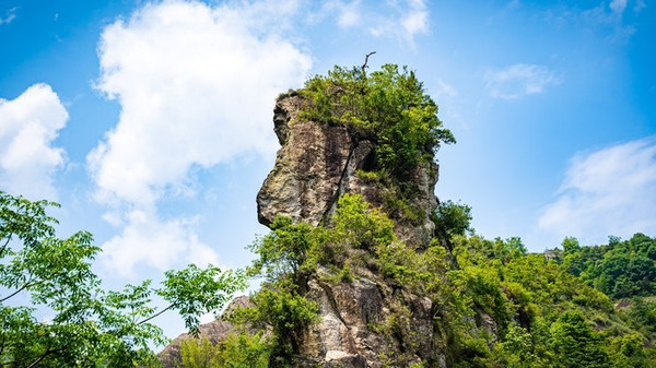 不仅如此,大龙湫景区还是有个集峰、嶂、瀑、溪之大成的景区。突兀峻拔的山峰,由于观察的角度不同,则呈现出拟人似物的无穷变化,有的像锋利的剪刀,有的似笔直的桅杆,有的如微微张嘴的鳄鱼,有的似偷吃蜂蜜的狗熊,还有的如面容慈悲的佛祖,有的像容姿瑰丽的昭君……总之给人一种“横看成岭侧成峰,远近高低各不同”的感觉与意趣。