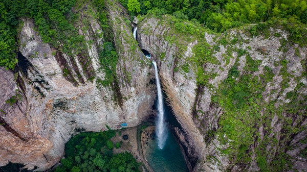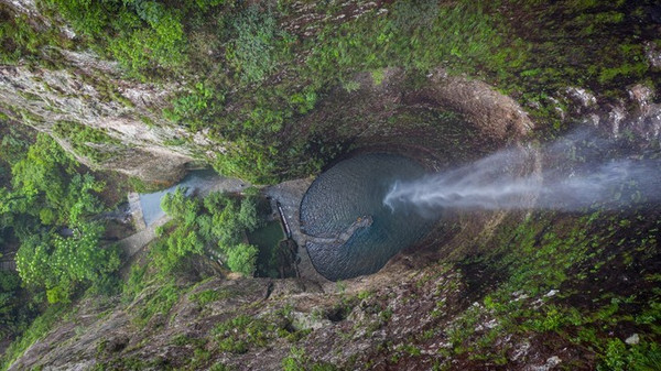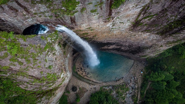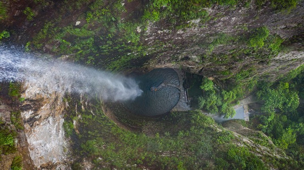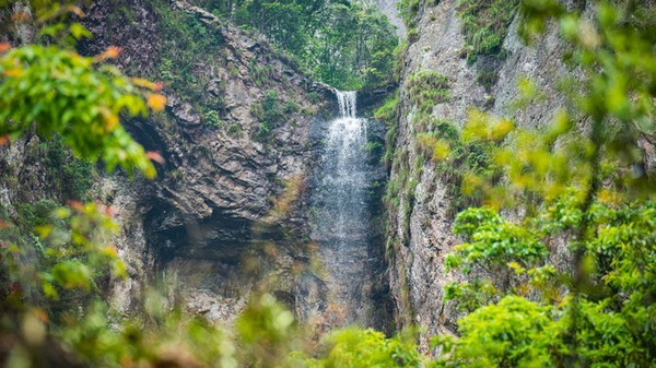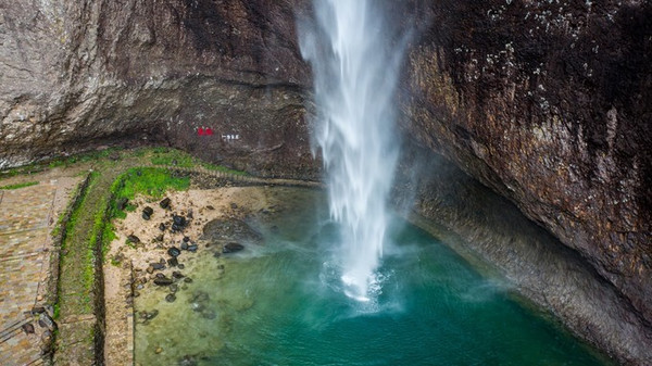 上折瀑虽与中折瀑有异曲同工之妙,但却更加的雄伟粗狂、壮丽幽深。它位于白云深处,深藏群山之中,四周峰峦叠嶂、林木葱笼,曲折迂回、时隐时现的山路石阶,令多数游人望而却步,因此也更具神秘感。只见一挂飞瀑从高约百米的洞顶撒入碧潭之中,白练长垂,四壁临空,犹如一束白光直射水潭。