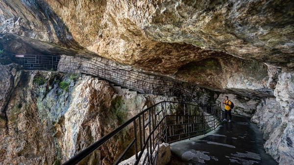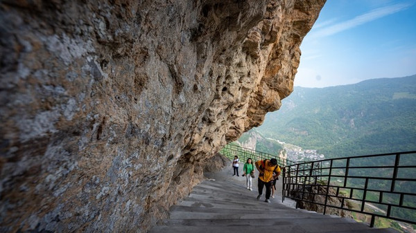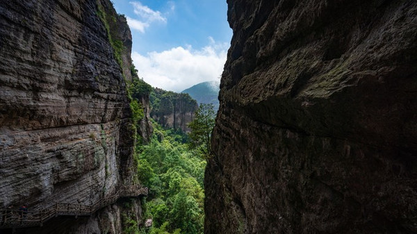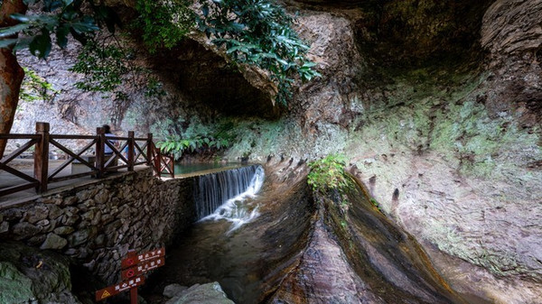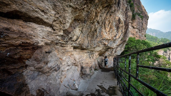 和 雁荡山 其他景区不同的是,当我们进入方洞景区之后,首先引入眼帘便是一条长1100米栈道。这些沿天然岩层开凿而成栈道不只是为了方便游客游客,更像是一本地理科普的书籍。高300余米岩嶂中间,横贯一条金黄色的近水平岩层,沿此岩层开凿栈道。从地质来讲,这一条长1100米的栈道,恰恰揭示了火山爆发形成凝灰岩与火山喷溢流纹岩层之间关系的大型断面,此处也是直观 雁荡山 火山第三期爆发的火山碎屑岩最佳处,为科学价值与美学价值完美的结合。所以说步入方洞栈道仿佛打开了一本地理科普书籍。