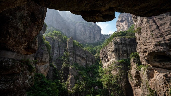 方洞之名源于各种神奇的天然古洞, 比如 关刀洞、梅花洞等等,其中以“方洞”称胜。沿着栈道一路行走,一边是深不见底的万丈深渊,一侧是千奇百怪的岩壁,而且不同洞口的高度也各有不同,有的高度让我们直接在岩石的下层中俯首穿行,有的视野辽阔令人产生“高处不胜寒”的错觉。行走在方洞栈道,时而凌空眺望,盘山公路如一条飘带蜿蜒缠绕,视野开阔;时而探身俯视,悬崖之下,满目苍翠, 雁荡山 山底观景尽收眼底。