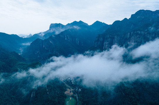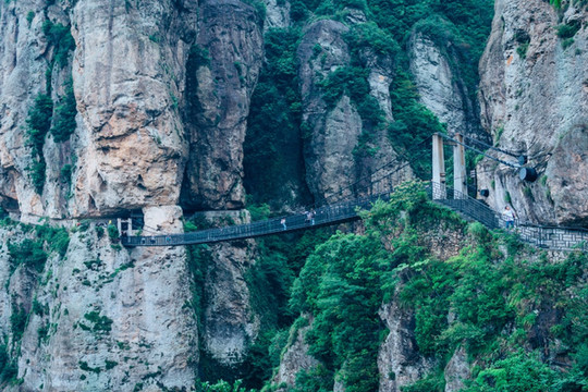 山谷口,天柱峰、展旗峰相距200米并立对峙,形成了著名的“南天门”。灵岩飞渡表演,就在这两扇石门上展开。