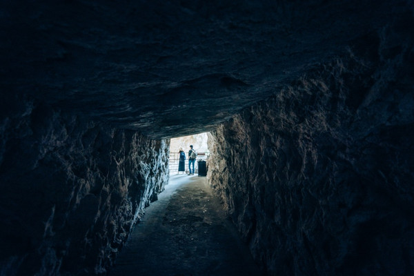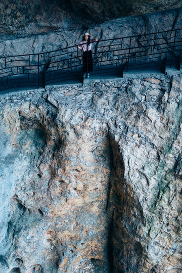 早上下起了小雨,可是我们的导游却神秘兮兮地告诉我,“可以不用带伞”。到了方洞才知其中玄妙。它虽是露天景区,但步道却是凹进山体的,形成一个C型,刚好是普通人的高度。
