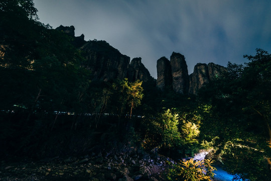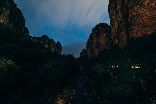 黑灯瞎火,打着手机电筒逛景区还是平生头一次。天泛着蓝光,山体漆黑,一根根条形山峰化作一尊尊神秘莫测的巨灵神,在螟蛉的大合唱中显得深冥幽玄。灵峰之“灵”在夜游中有了另类体验。