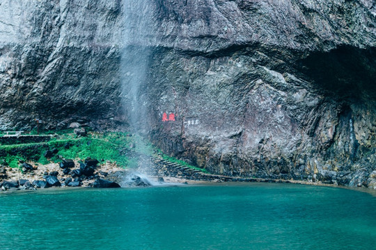 灵岩不同于灵峰,地形更逼仄,山崖光滑笔直,Z型栈道将游人引入山谷最深处。那里有一汪碧绿水潭,一条细长的瀑布飞泻而下。水滴在山谷飞溅,夹杂着青苔的气息,负氧离子稠密。深深呼吸,沁人心脾。