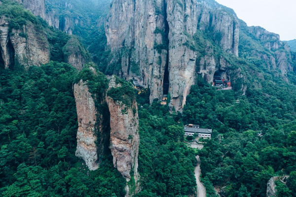 飞拉达位于雁荡山北谷龙西乡沓屏峰之上。这座山远看像一只倒立高跟鞋,当地人称为“百丈岩”。将无人机升至200米,呈现出一副类似《魔戒》里的玄幻画面。