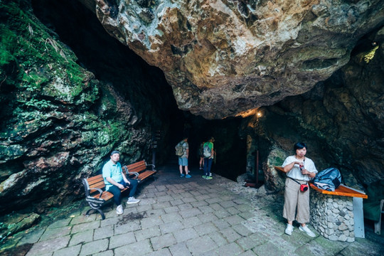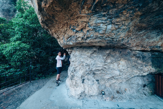 又沿着一条幽深的台阶小路走入了灵峰古洞。洞内迂回曲折,深幽奇特。云雾、透天、含珠、隐虎、好运、玲珑、凉风七洞洞洞相连。洞底凉爽宜人。走出去后,洞顶便是东西瑶台。升起小飞机,拍摄一张招牌全景。