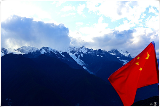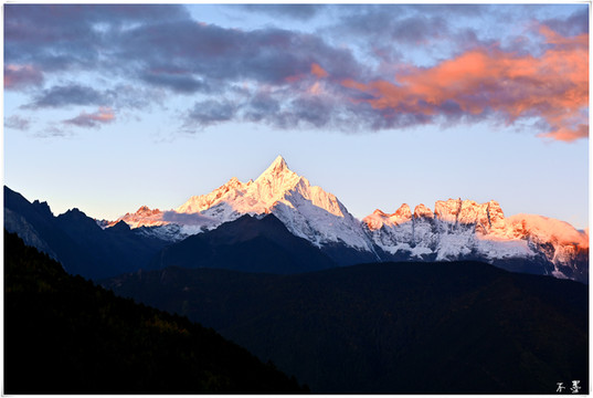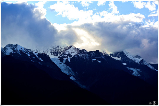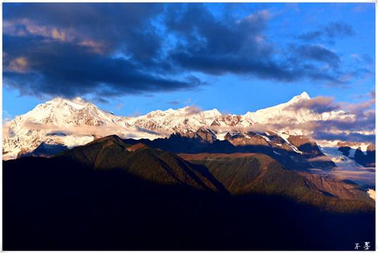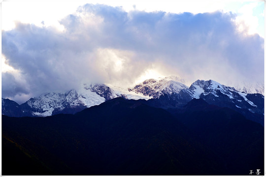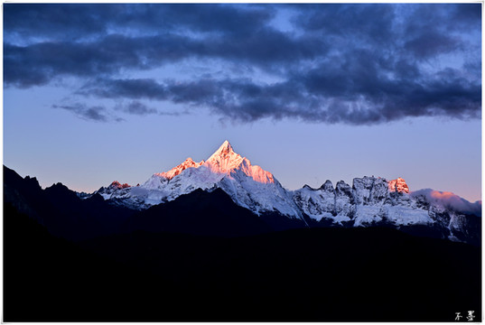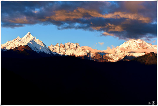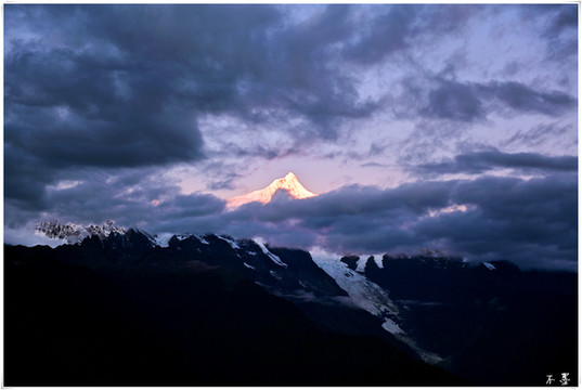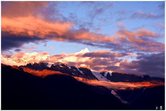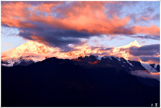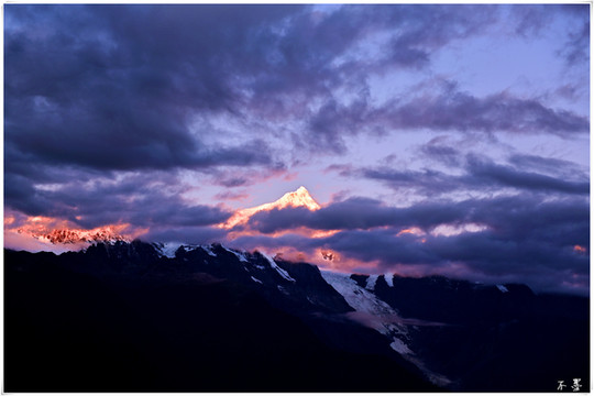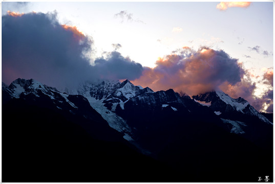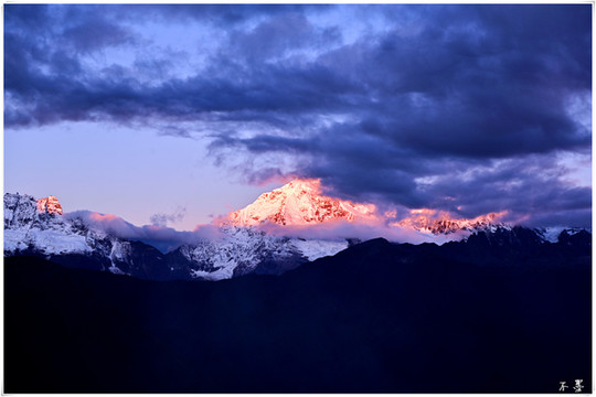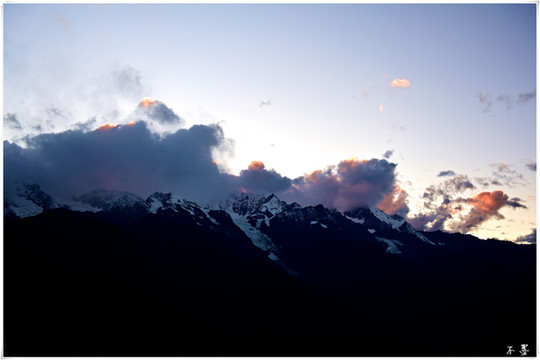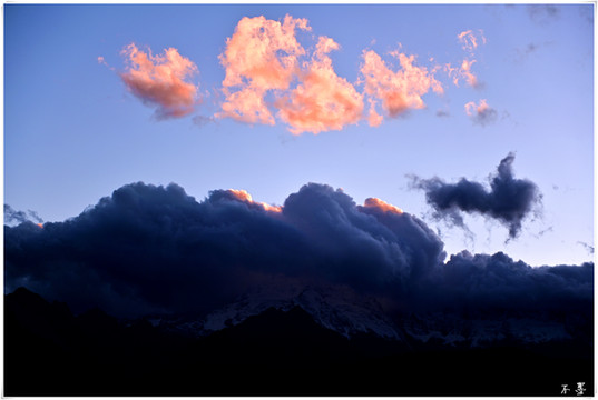 随着太阳落山,滚滚乌云渐渐淹没雪山,乌云之上,片片红霞挂在云端,似乎预示着明天将是个大晴天。