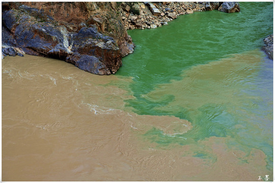 绿色的定曲河汇入浑黄的金沙江,黄绿分明。