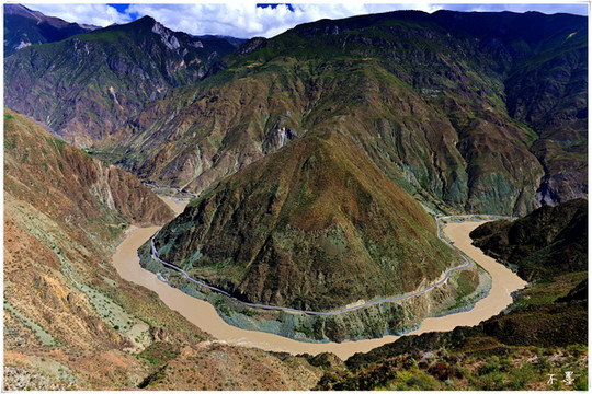 观景台俯瞰,奔流于高山峡谷中的金沙江,在此转了一个大弯,形如一个倒扣的希腊字母 Ω,这真是大自然的鬼斧神工。形如此类的大湾,在国内的大江大河中并不鲜见,她们各有各的美。怒江第一湾秀丽,黑龙江第一湾平静,相比较,金沙江大湾最壮美。