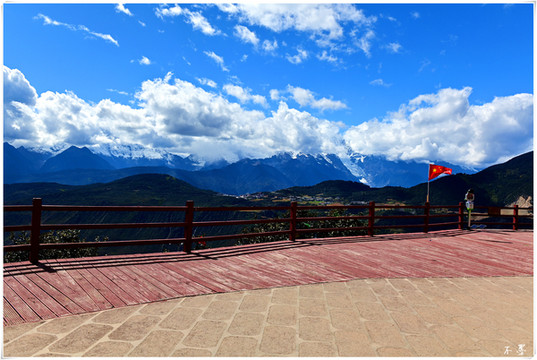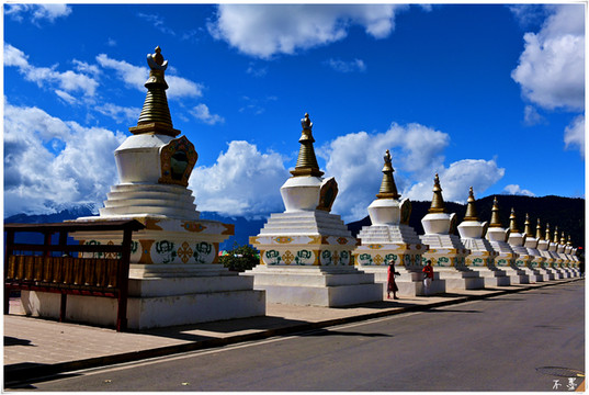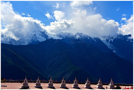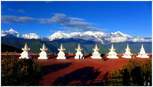 雾浓顶观景台是观梅里雪山全景的绝佳位置,天空白云滚滚,雪山群峰竟秀,田野、村庄如秘境隐匿山间。可惜当时云有些厚,雪山藏在云层里若隐若现,看不太真切。观景台有十三座白塔,所以也叫十三白塔迎宾台,与梅里雪山十三座雪峰对应。