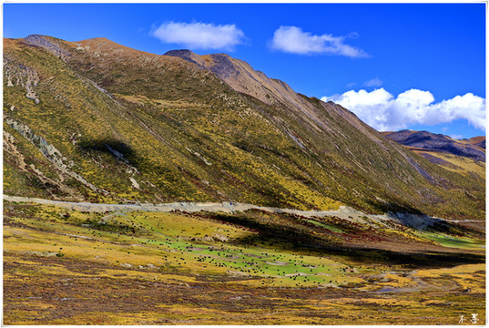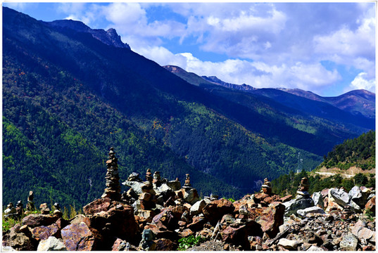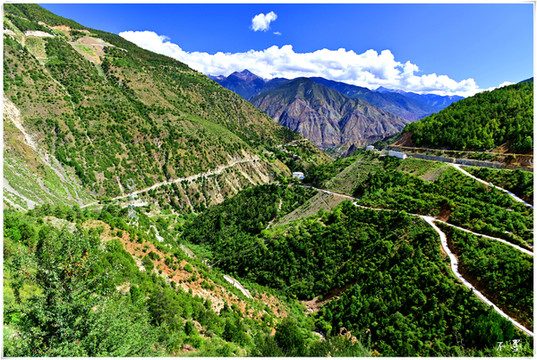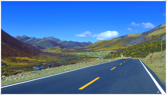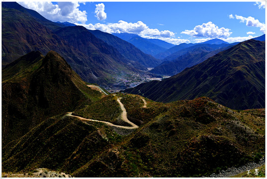 公路在山间盘旋,一层层从谷底升至山巅,小村、寺庙静静的散落在山腰,路边的玛尼堆默默把祝福和好运带给经过的人。
