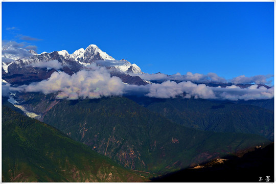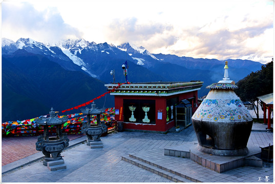 云雾翻滚,雪峰隐约,山莽莽如黛,雪皑皑似银。伴着煨桑台烟雾缭绕,雪山愈显神秘,祈盼明天云开雾散,一睹卡瓦格博芳容,亲见日照金山奇观。