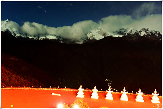 晚饭后,来到客栈楼顶平台,月牙当空,云没那么厚了,雪山比白天更清晰,卡瓦格博峰露出尖顶。