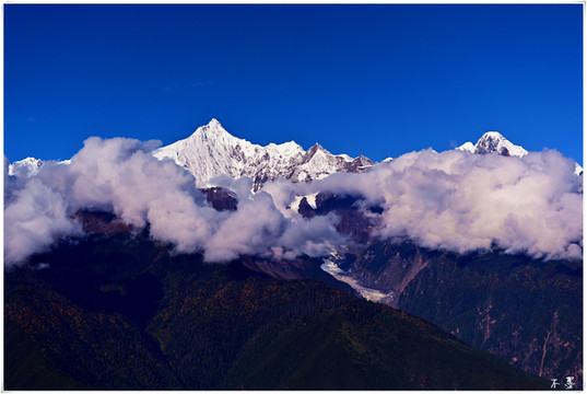 远处山巅,白色云浪之下,梅里雪山渐露真颜。