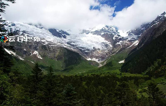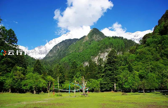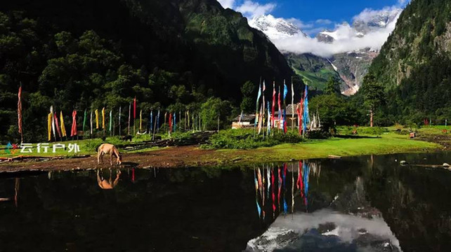 进入原始丛林前经过的高山草甸,凡遇到重大的佛教节日都会在这里举行各种宗教仪式,草甸后面是茂盛的原始丛林和洁白的雪峰,雪峰脚下的冰湖便是我们今天的目的地。