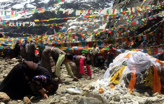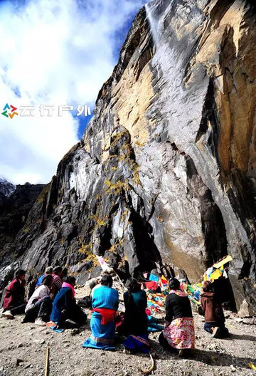 神瀑是梅里雪山朝圣的终点,来梅里雪山朝圣的人都会在神瀑下接受神水的洗礼,把一生的罪孽在神山下洗刷掉。这是在神瀑下朝拜神山的信徙,他们双手合拢、紧闭双眼,不断的念诵佛教中的经文,以最虔诚的心在神山前许愿,为家人和朋友祈福。