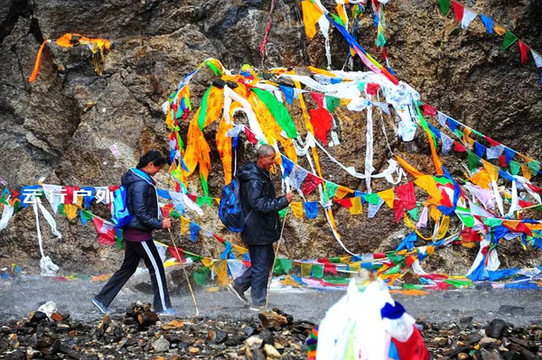 当走到路边全是经幡的地方,这就到了南宗垭口了,这些都是前来朝圣的藏族人挂的,这些经幡就更两面五彩的墙,给前来雨崩的人指明朝圣的方向。
