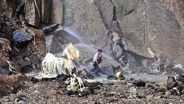 顶礼膜拜完神瀑,接着是进行最神圣的一项仪式,就是接受神瀑圣水的洗礼,神瀑的水是被誉为梅里雪山的甘露,能洗净人身心的五毒。所以在转神瀑是不能打伞或带帽子,淋的水越多越好,一般是绕三圈,虔诚的人可以绕十三圈,最多的可以到达108圈。