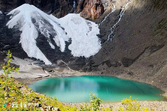 当从笑农大本营徒步四十分钟见到美丽的冰湖时,发现之前的辛苦都是值的得,夏天冰湖的水呈献出碧绿色,就象一块绿色的翡翠镶嵌在雪山峡谷之间。