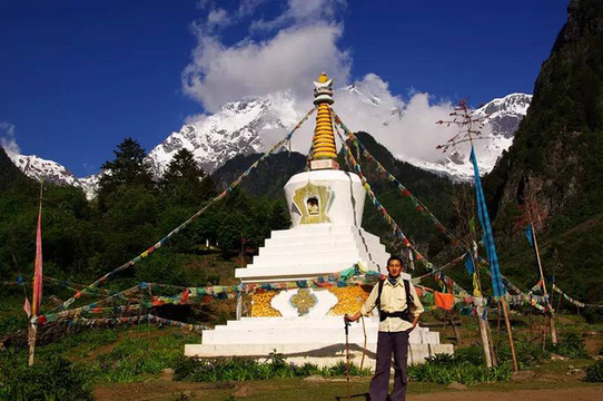 欣赏完雨崩内的日照金山,便要开始前往雨崩的另一个重要目的地—笑农大本营和冰湖。单程距离为12公里,往返24公里,这是雨崩上村醒目的白色佛塔,也可以做为徒步的起点。