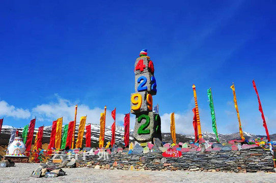 这是新修的白马雪山垭口的标志,4292米的海拨高度在蓝天下格外醒目,这也是滇藏线所经过的第一个高于4000米的雪山垭口。