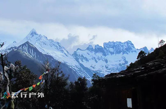 住在雨崩下村的好处,就是清晨起来在房间里就可以看到U型山谷间的两座洁白雪峰,这两座雪峰分别是神女峰和五冠峰。