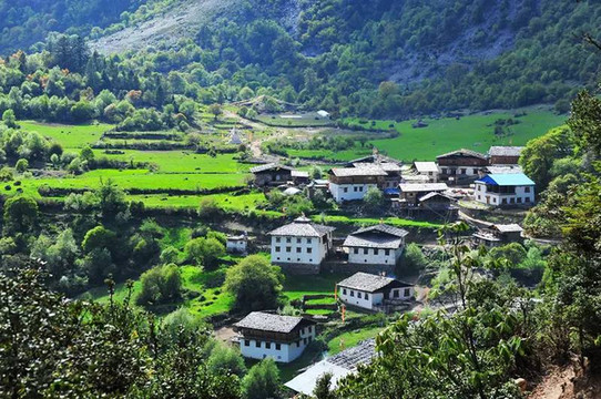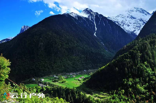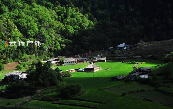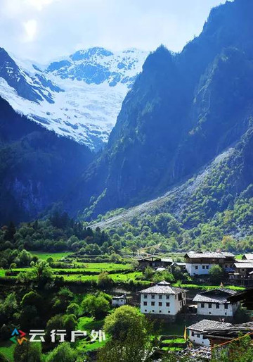 站在雨崩上村是可以看到雨崩下村全景的,雪山下宁静的雨崩下村呈一个绿色的等边三角形,三面都被山谷所包围,在绿色的山谷里点辍着一些白色的小房子,这都是当地藏民的家园,不过现在多数已经改造成客栈了。
